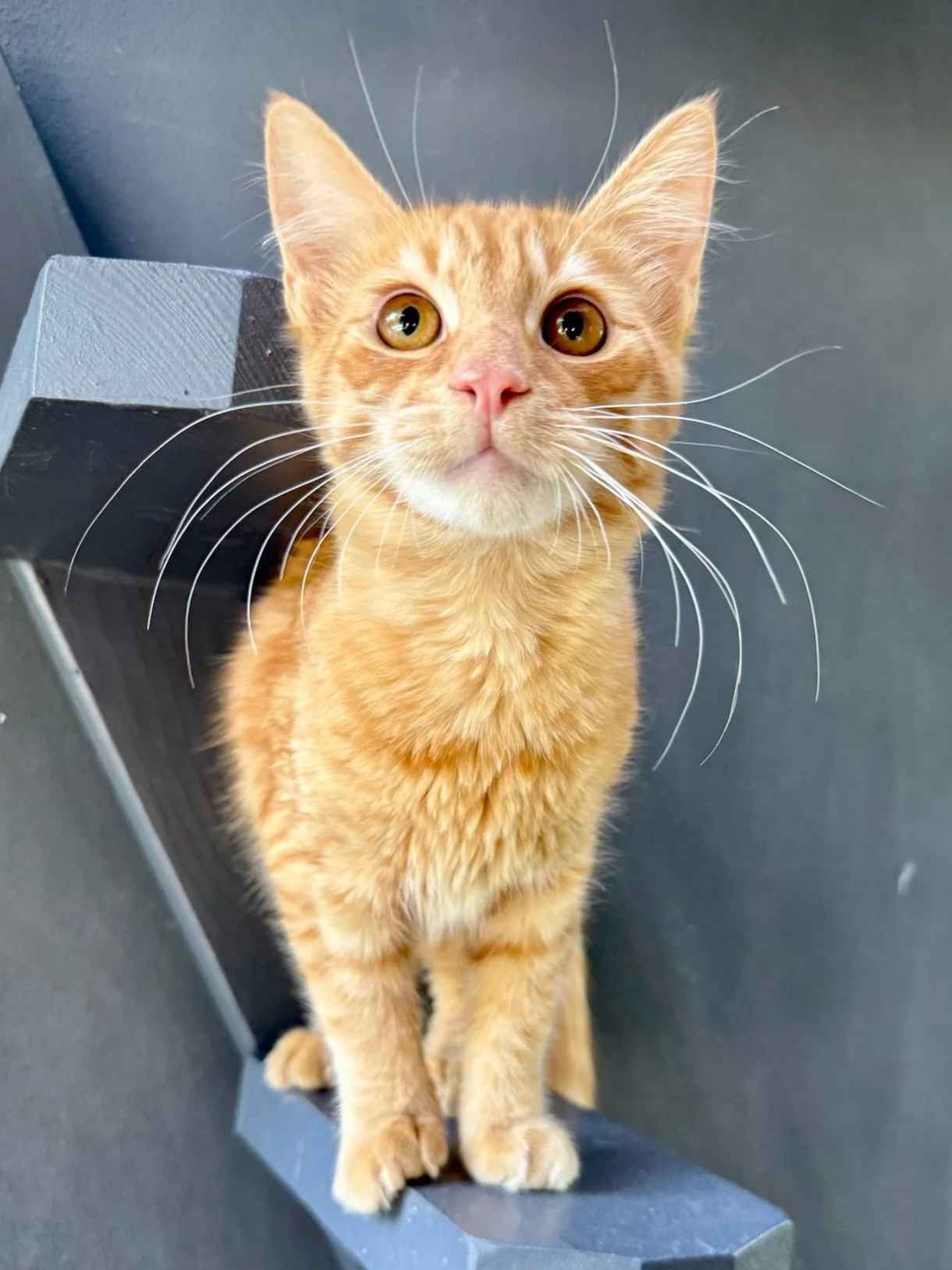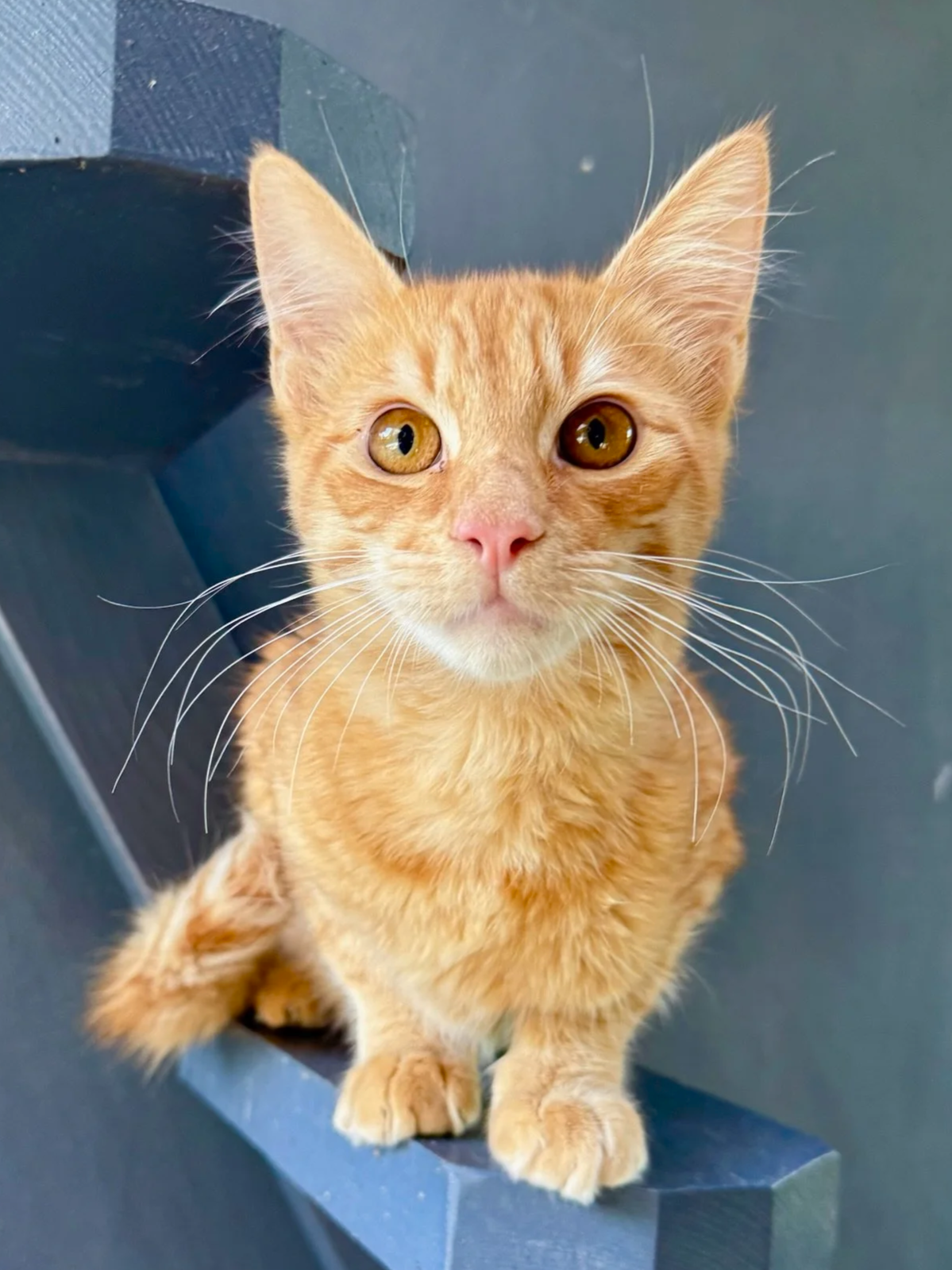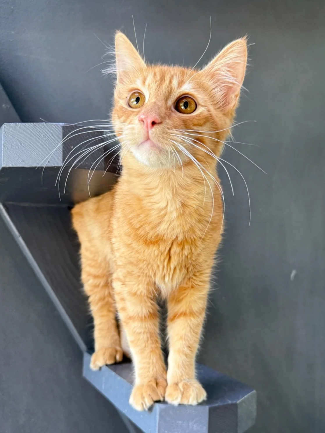 This orange tabby is all bright eyes, oversized ears, and intellectual curiosity. Much like the brainiac from The Breakfast Club, he approaches life with thoughtful intensity, as though every crinkle ball presents a solvable equation and every new room requires careful analysis before full-scale exploration. He doesn’t rush the process; first he studies it, and then he aces it.