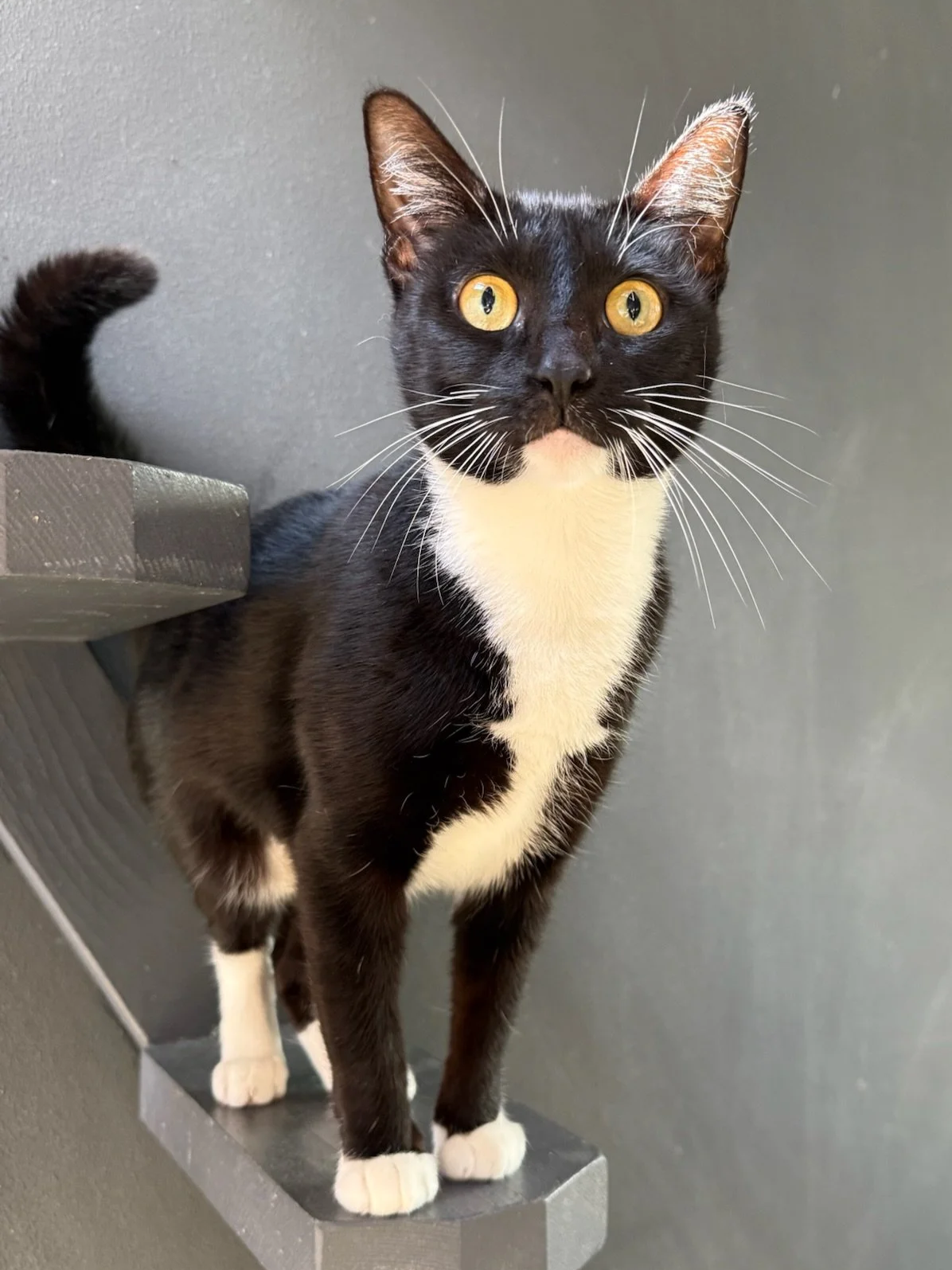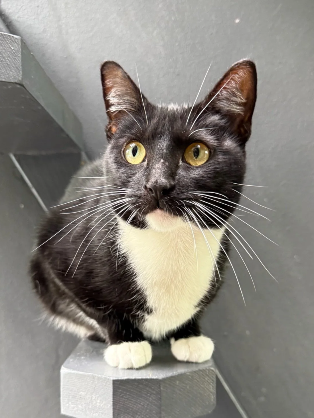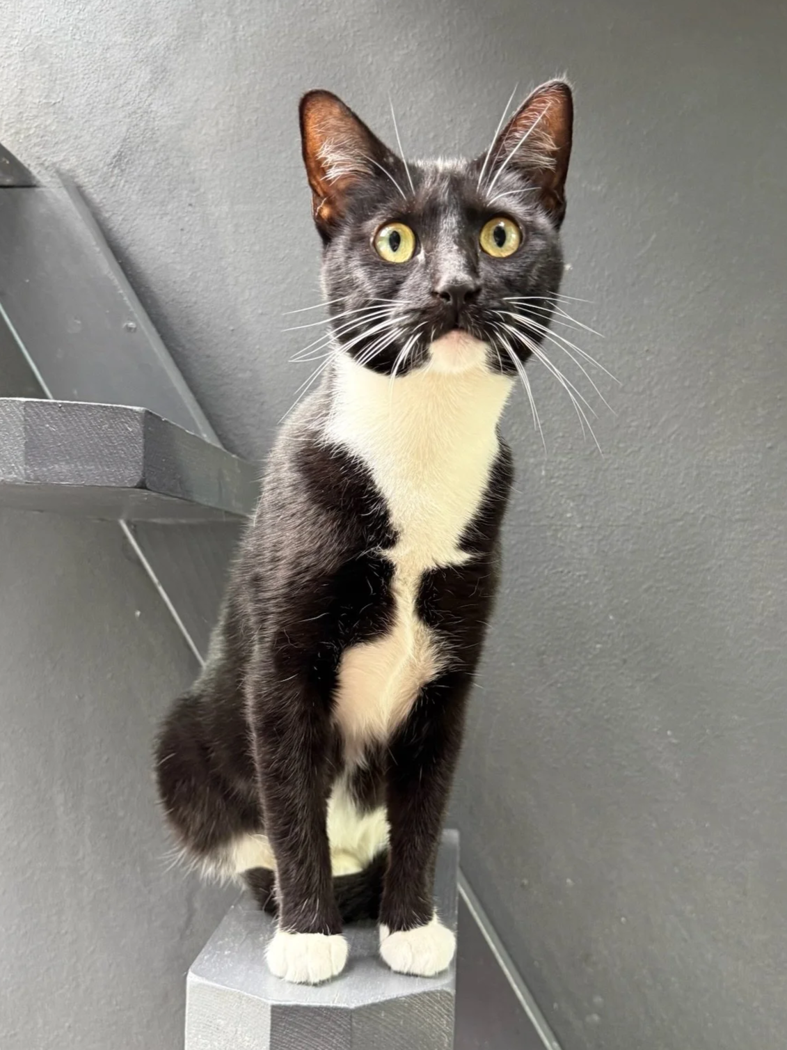 Along with her five kittens, this tuxedo queen was found during a torrential downpour in East LA last October, hydroplaning through flooded gutters and navigating open asphalt like it was an unsanctioned street circuit. Conditions were bleak. Visibility was low. Her babies were soaked and shivering. And yet, she kept the formation tight and the engines running.
